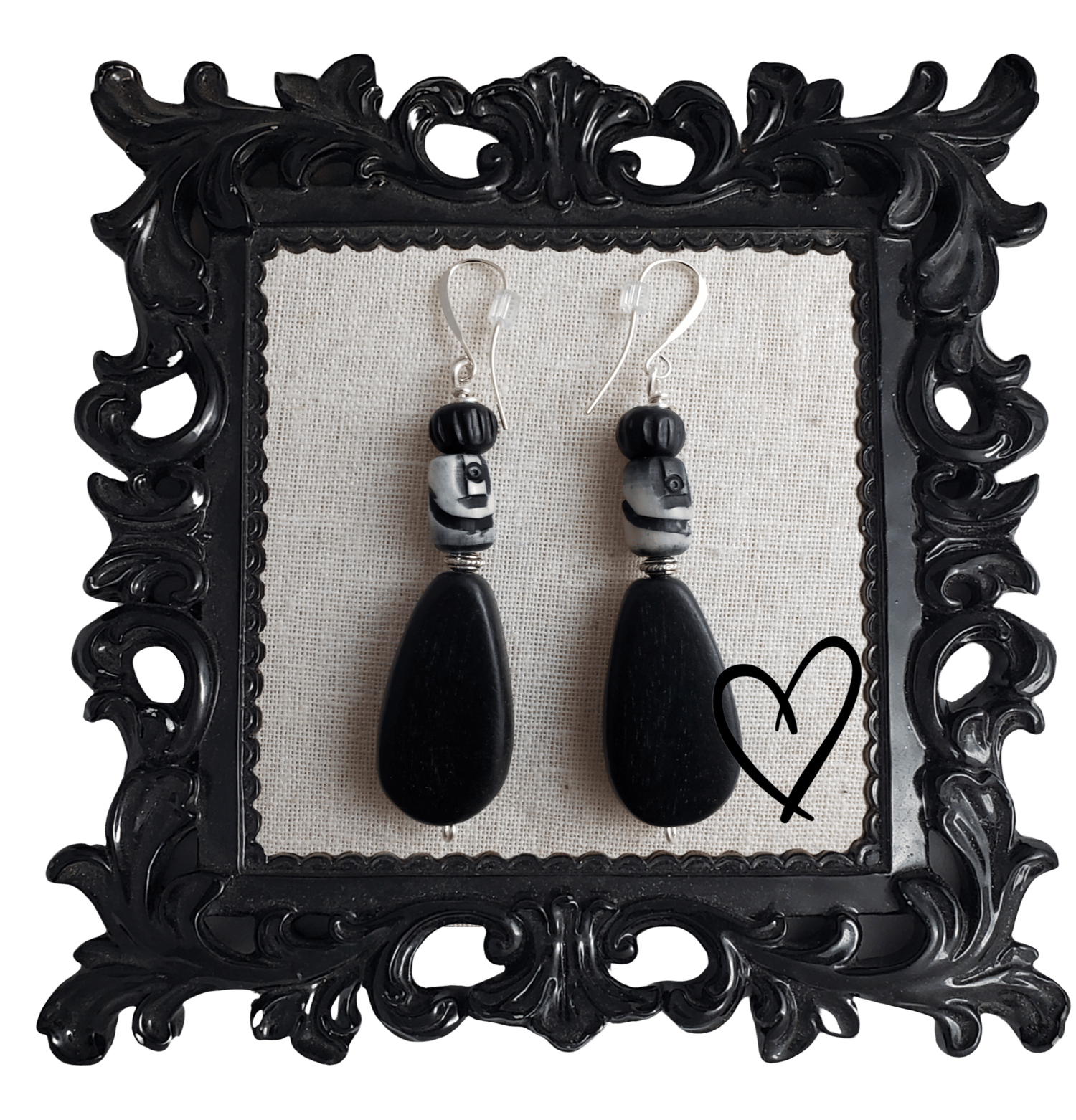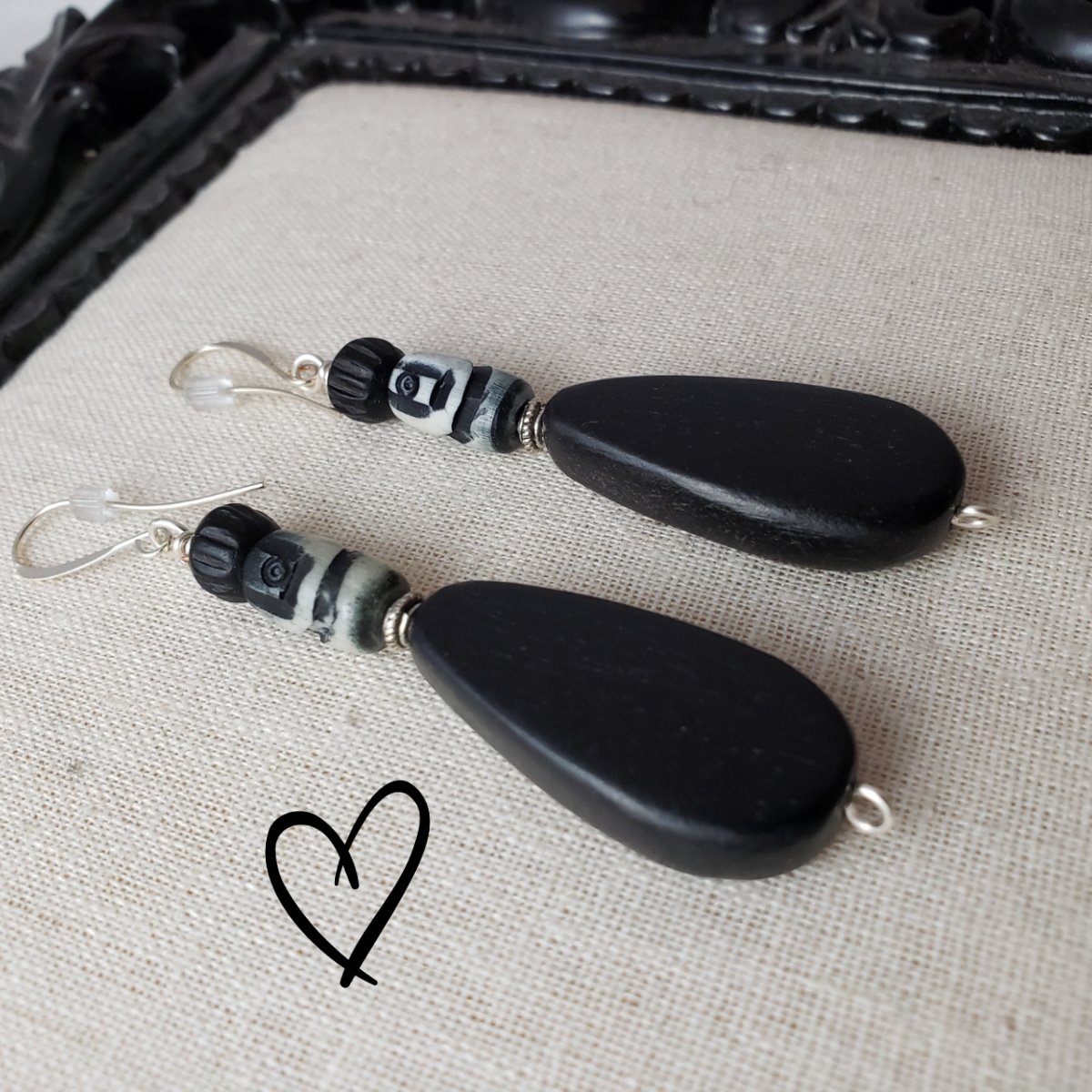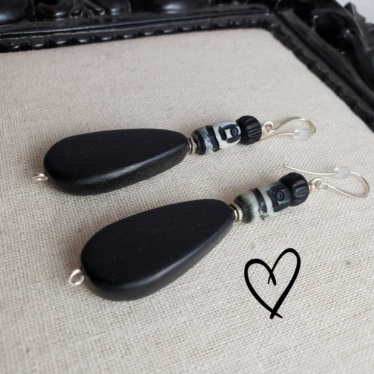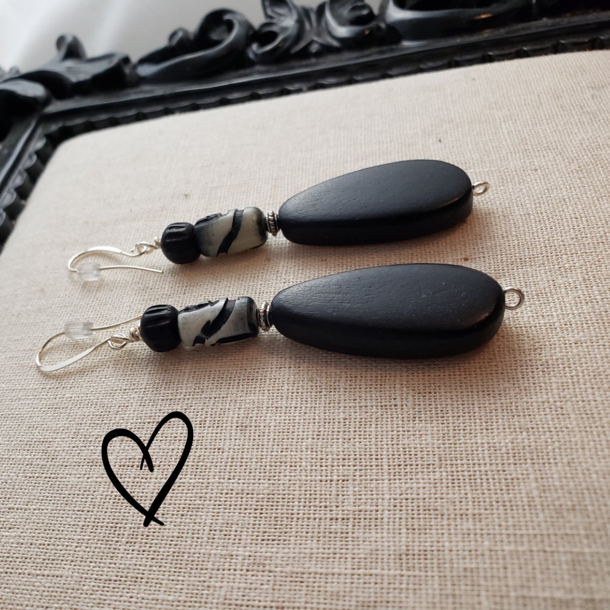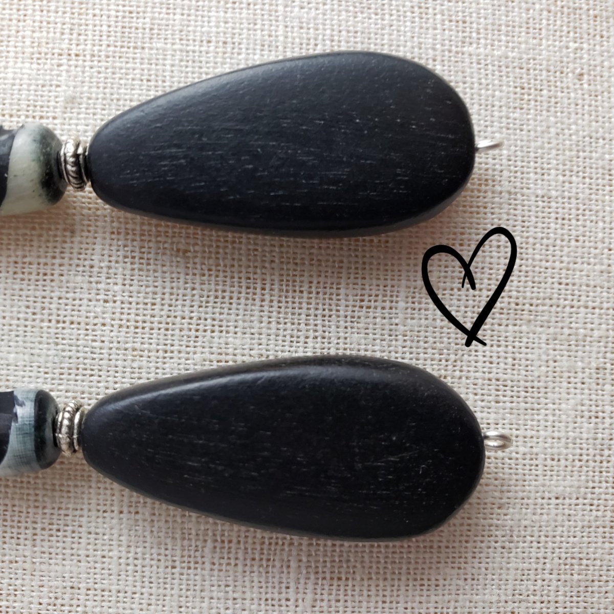 WOOD & BONE COLLECTION. ONYX COLORED WOOD AND CARVED BONE. SILVER-PLATED EARWIRES. HANDMADE. USA. 3IN TOTAL LENGTH INCLUDES EARWIRE.